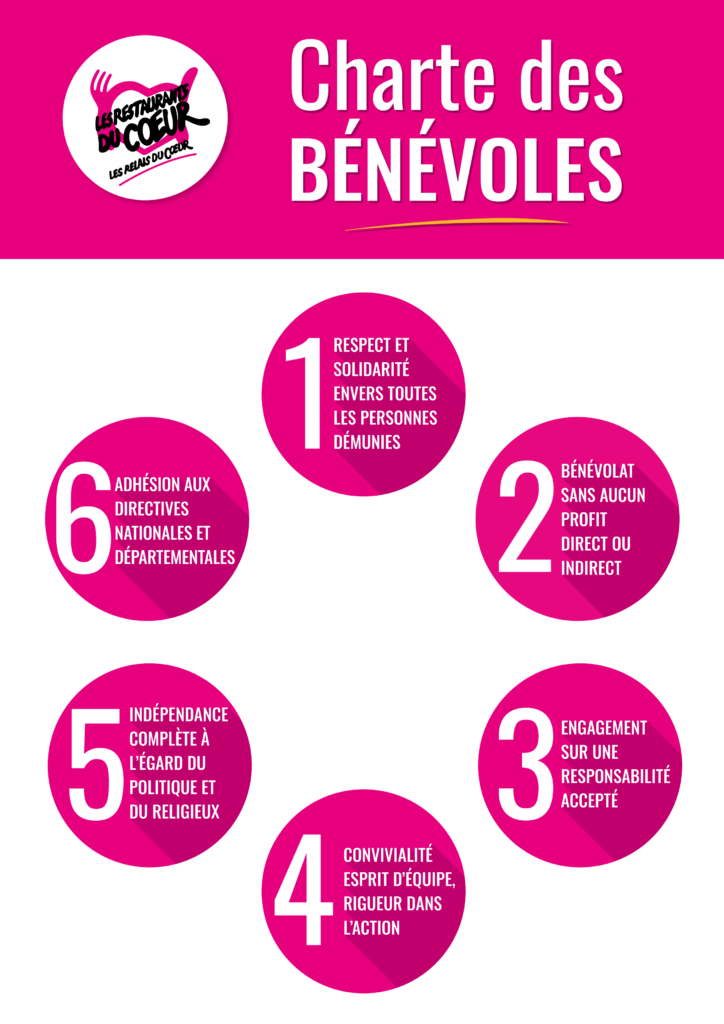 Lorsque des bénévoles désirent s’investir aux Restaurants du Cœur, ils doivent s’engager autour de la charte des bénévoles et par là même respecter une totale neutralité vis à vis du religieux, du politique, du syndical, quand ils agissent au sein des Restos et au nom des Restos (Point 5 de notre Charte des Bénévoles ci-dessous). Les bénévoles viennent de façon volontaire et adhèrent donc tout aussi volontairement à nos règles.